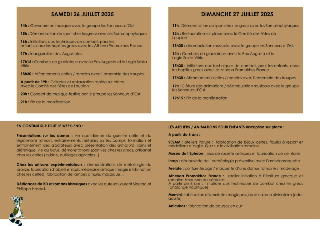 Les Augustales Loupian 2025 proposent également des activités participatives : initiation à l’archerie celte, ateliers pédagogiques pour les enfants (inscriptions sur place), découvertes archéologiques, musique et dédicaces de bandes dessinées historiques.