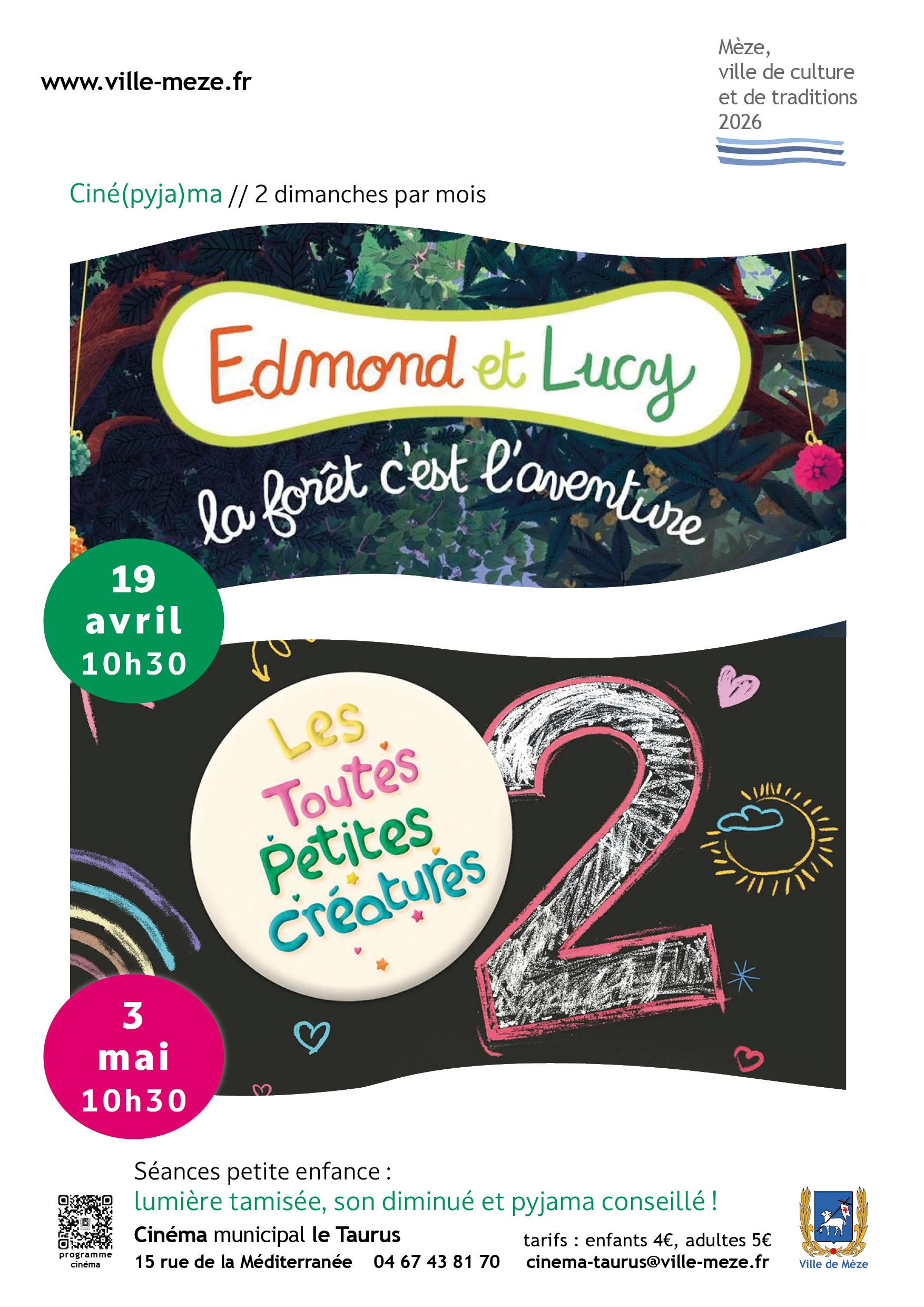 Le Ciné(pyja)ma revient au cinéma municipal Le Taurus de Mèze pour une nouvelle séance dédiée à la petite enfance ! Ce dimanche 3 mai à 10h30, venez en pyjama découvrir Les Toutes Petites Créatures 2, un court-métrage d’animation signé Lucy Izzard, produit en Grande-Bretagne en 2026.