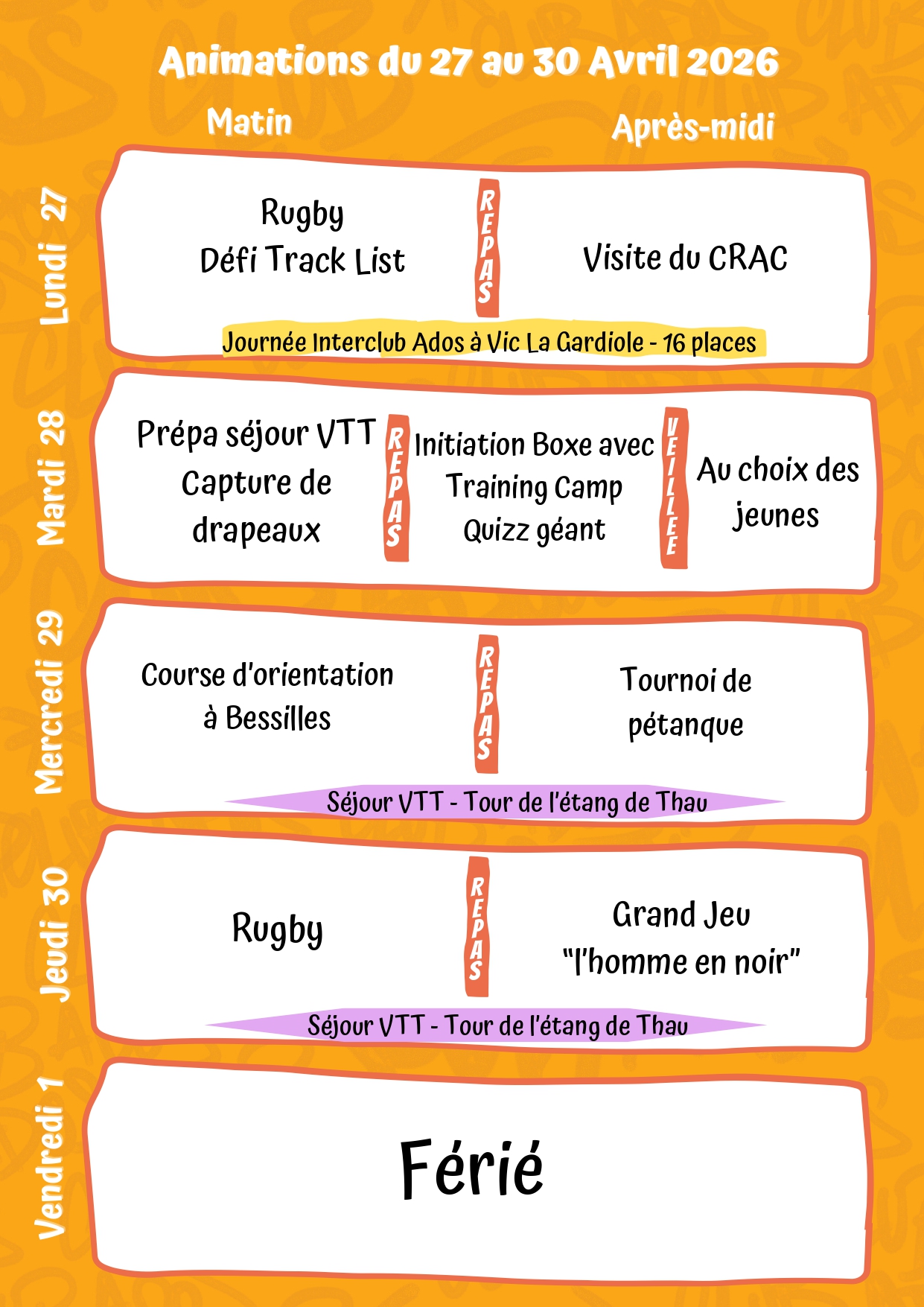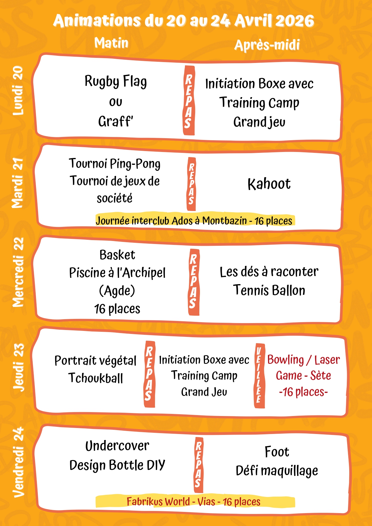 Le Club Ados, le centre de loisirs de la Ville de Sète pour les 12-15 ans, propose un programme riche et varié durant toutes les vacances de Pâques 2026, du lundi 20 au jeudi 30 avril. Sport, créativité, sorties et rencontres sont au rendez-vous pour que vos ados passent des vacances inoubliables !