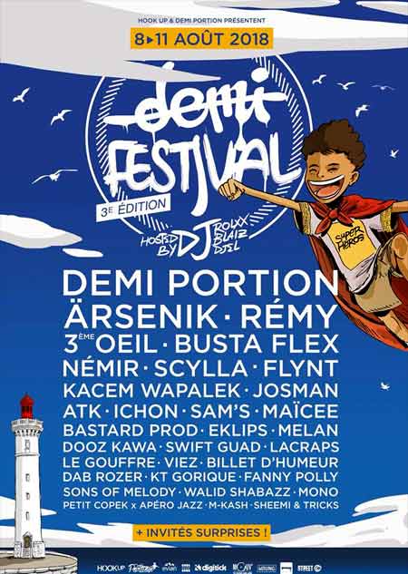 Demi-Festival 2018 Demi Portion Rap Hip Hop Sète. Du 8 au 12 Août 2018. 3ème édition du Festival. Au Théâtre de la Mer à Sète. Organisé par l’artiste Demi Portion, Troisième gros FESTIVAL HIP HOP dans la ville de Sète avec la même équipe …Le plus gros rassemblement de rap français en été !