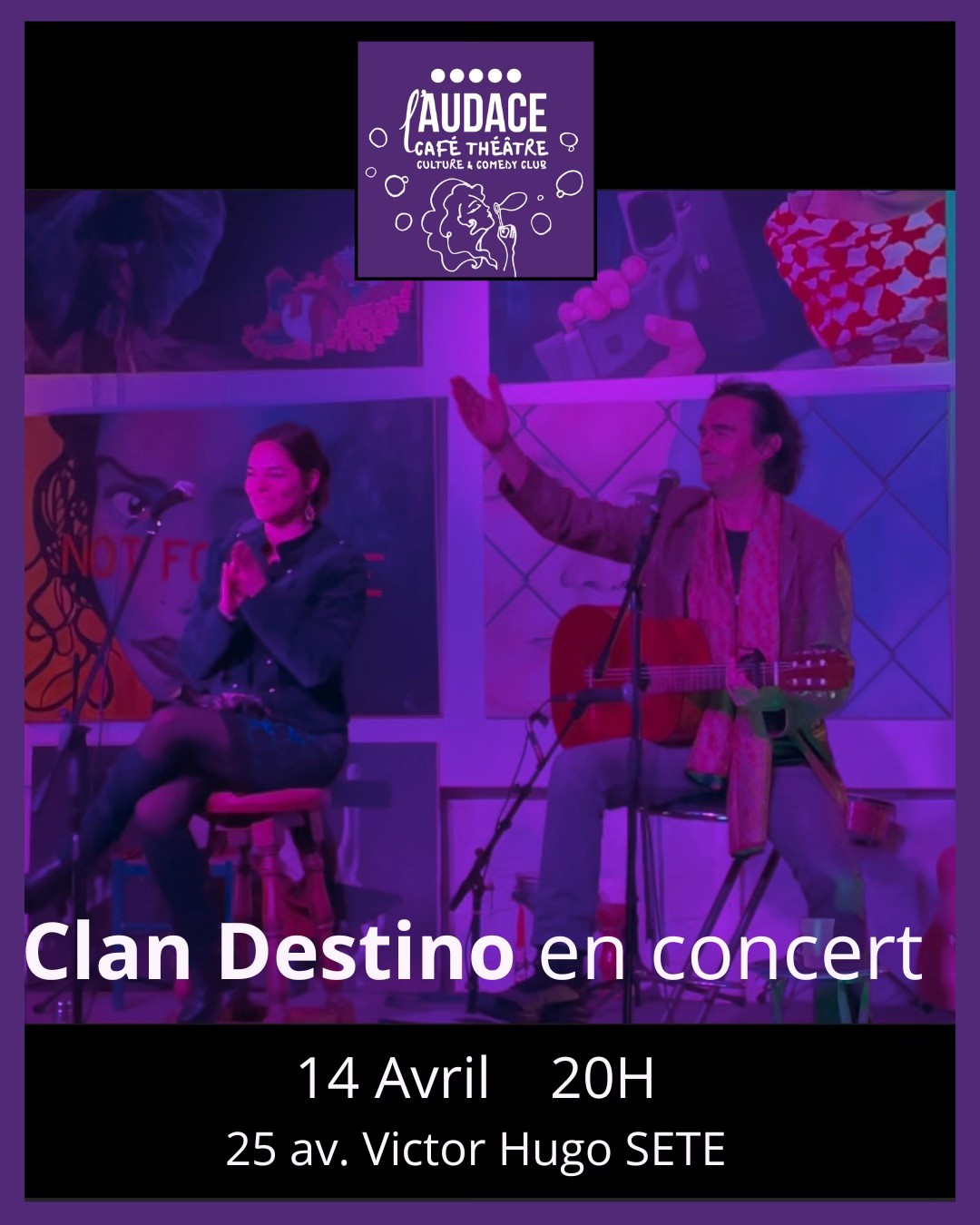 Le duo Clan Destino investit la scène de L’Audace Café Théâtre, 27 avenue Victor Hugo à Sète, pour un récital intimiste et chaleureux le mardi 14 avril 2026 à 20h30. Au programme : la chanson latino-américaine de langue espagnole dans toute sa splendeur, portée par deux voix complices et une guitare envoûtante.