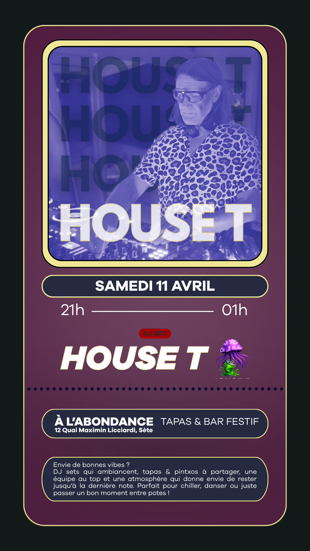 Le samedi 11 avril 2026, le bar festif À l’Abondance vous invite à une soirée musicale animée par le DJ House T. De 21h à 1h du matin, les platines tourneront dans l’une des adresses les plus vivantes de Sète, pour une nuit placée sous le signe de la bonne musique, du partage et de la convivialité.