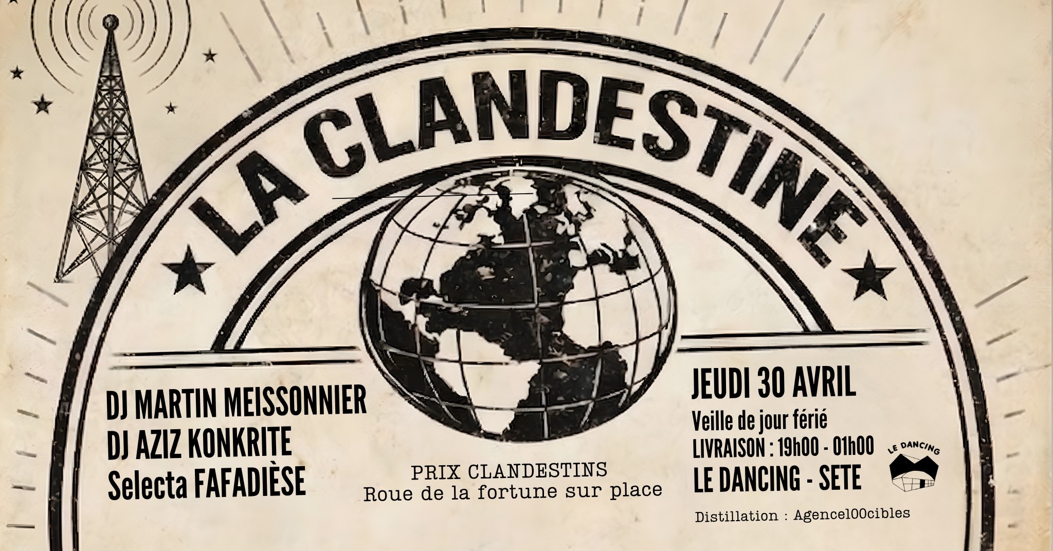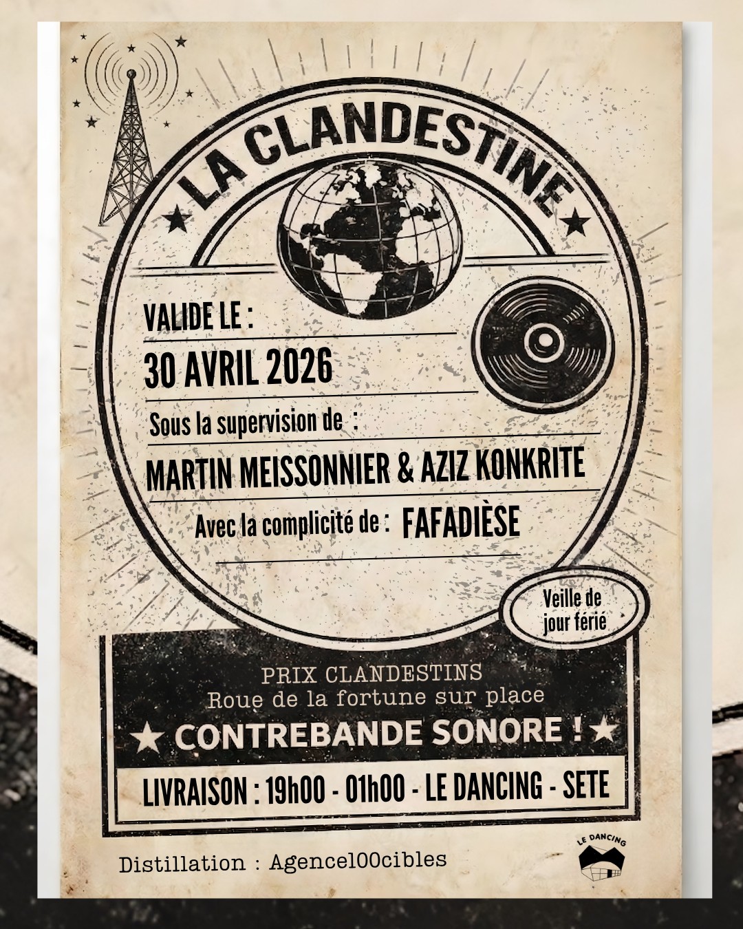 La Clandestine débarque pour son Épisode I au Le Dancing (1469 Quai des Moulins, Sète) le jeudi 30 avril 2026, veille de jour férié. Un voyage musical sans frontières imaginé par deux collectionneurs de l’ombre : DJ Martin Meissonnier et DJ Aziz Konkrite, accompagnés de la Selecta Fafadièse.
