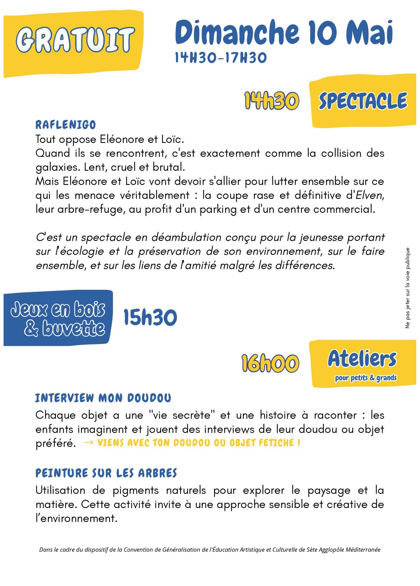 Dès 14h30, la Compagnie du Vent Sous Les Semelles présente « Raflenigo », un spectacle de théâtre en déambulation teinté d’écologie, d’amitié et de préservation de l’environnement. Une forme vivante et itinérante qui invite petits et grands à suivre les comédiens à travers l’espace naturel.