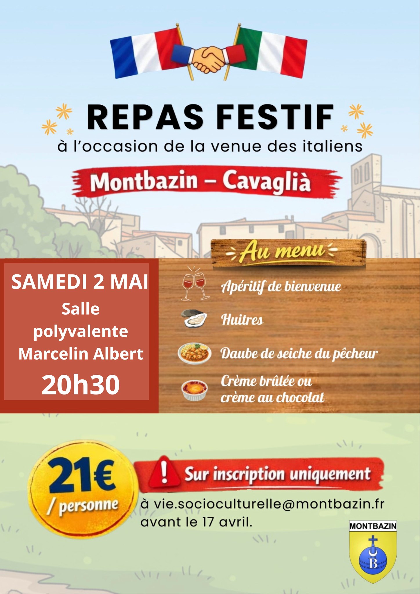 Le dîner se déroulera à la Salle polyvalente Marcelin Albert, Montbazin, et proposera un menu généreux : apéritif de bienvenue, huîtres, daube de seiche du pêcheur, et en dessert au choix crème brûlée ou crème au chocolat. Une soirée placée sous le signe de l’amitié franco-italienne et des saveurs locales.