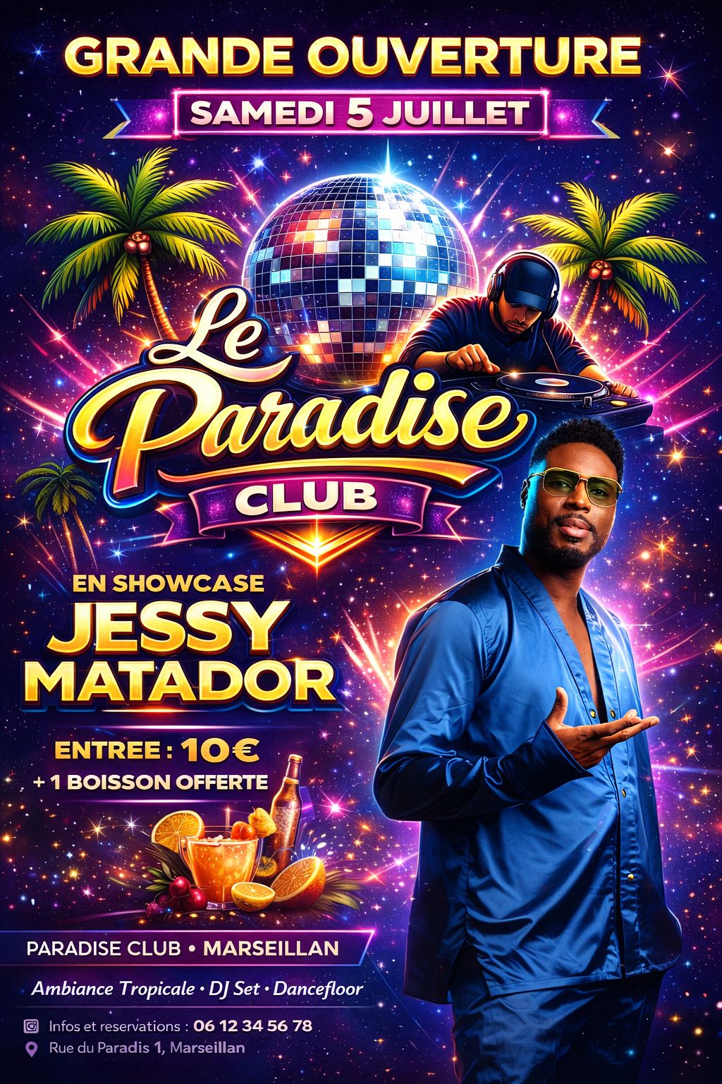 Le Paradise Club ouvre enfin ses portes à Marseillan et vous convie à une soirée d’ouverture exceptionnelle le samedi 5 juillet 2026 à partir de 23h00 ! Pour célébrer cet événement mémorable, le club a frappé fort en invitant Jessy Matador pour un showcase exclusif qui promet de mettre le feu au dancefloor dès les premières minutes.