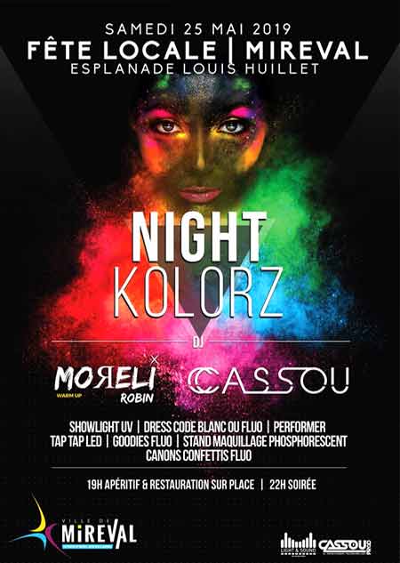 Soirée Night Kolorz – Fête de Mireval. Samedi 25 Mai 2019. Sur l’Esplanade Louis Huillet à Mireval. A partir de 19H00 apéritif et restauration sur place et à 22H00 Soirée avec DJ Robin Moreli et DJ Cassou. Showlight UV, Dress Code blanc ou fluo, performer, Tap Tap Led, Goodies Fluo, Stand Maquillage phosphorescent, canons confettis fluo.