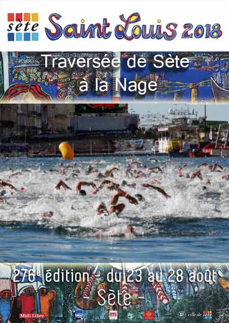 Traversée de Sète à la Nage St Louis 2018. Lundi 27 Août 2018 (Lundi de la Saint Louis) . Au Quai Léopold Suquet ( Cadre Royal ) à Sète. à 9H00 : Départ de la petite traversée de Sète à la nage (1000 m) et à 10H00 : Départ de la 99ème édition de la traversée de Sète à la nage (2580m). Épreuves de Coupe de France de nage en eau libre, organisée par Sète Natation Entente Dauphins-Dockers.