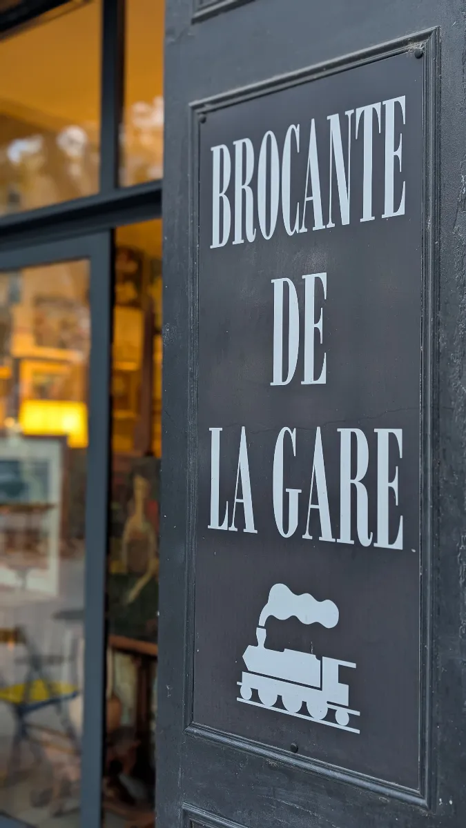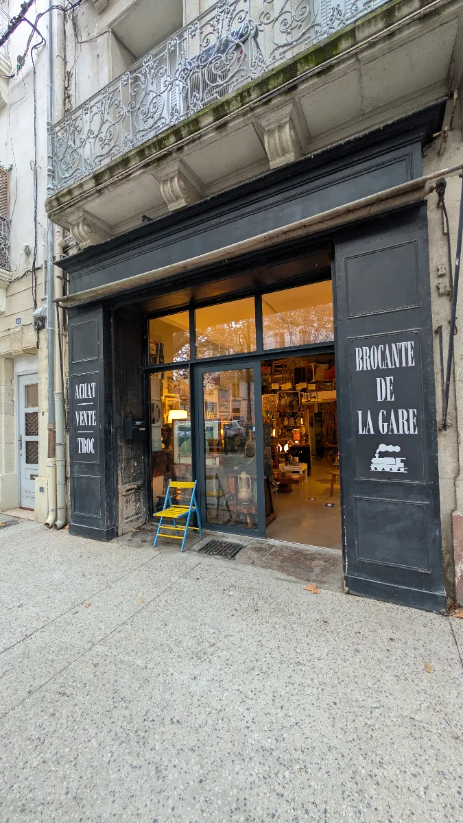 Nous avons découvert la Brocante de la Gare, installée au 10 avenue Victor-Hugo à Sète, entre le Pont de Pierre et le Théâtre Molière. Reconnaissable à sa devanture gris anthracite sobre portant les inscriptions « Achat – Vente – Troc » et ornée d’un pictogramme de locomotive à vapeur, cette adresse incarne l’esprit de la brocante traditionnelle où chaque visite réserve des découvertes inattendues.