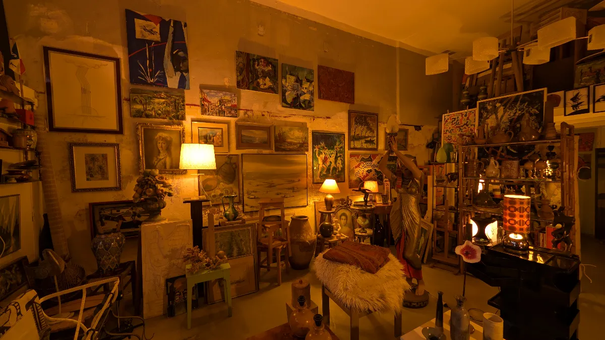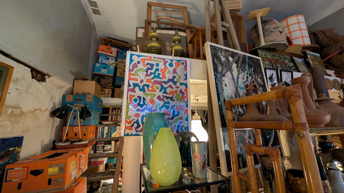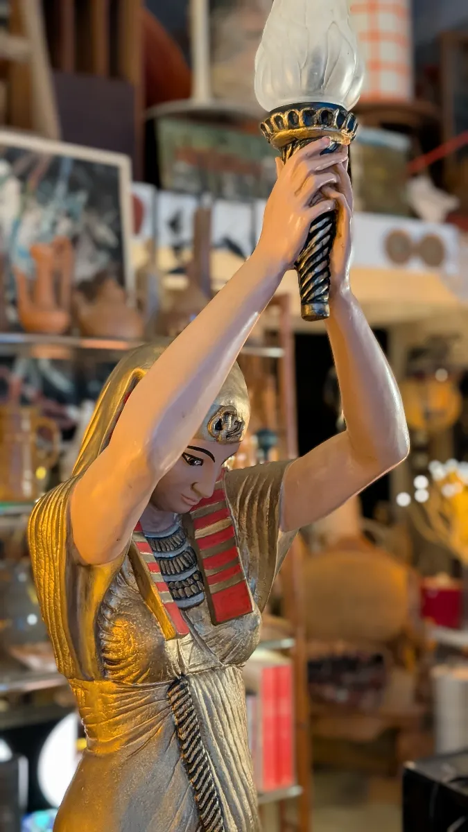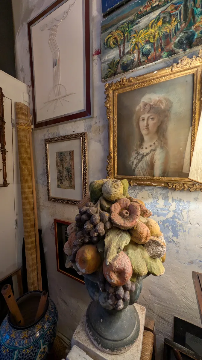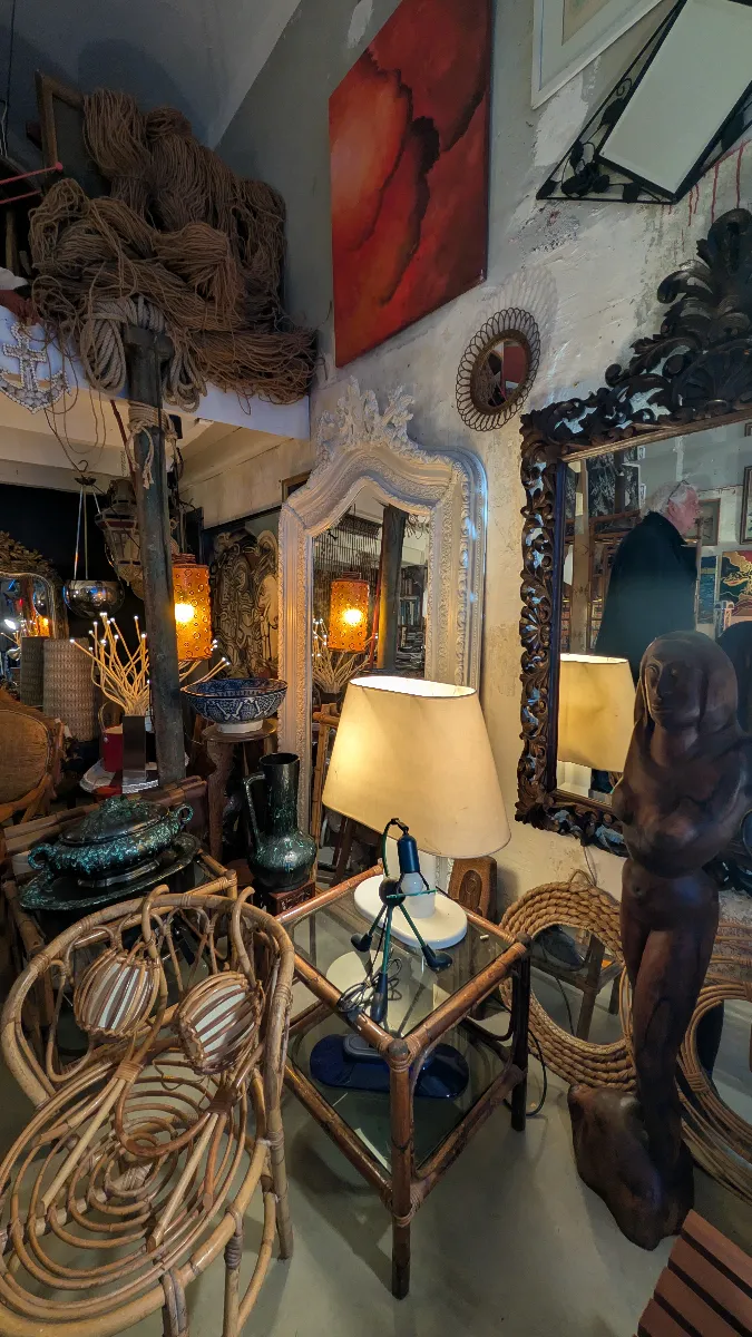 L’intérieur de la Brocante de la Gare ressemble à une véritable caverne d’Ali Baba. Les espaces sont organisés en univers qui se superposent et s’entremêlent : tableaux anciens (portraits, paysages, natures mortes dans leurs cadres dorés), mobilier (chaises cannées, fauteuils en rotin, tables basses), luminaires (lampes égyptiennes art déco, suspensions, lampes de chevet), sculptures et bustes (corbeilles de fruits en céramique polychrome, statues égyptiennes), miroirs ouvragés, verrerie, bijoux vintage exposés sous verre, objets décoratifs éclectiques, et même des caisses de marques d’oranges vintages.