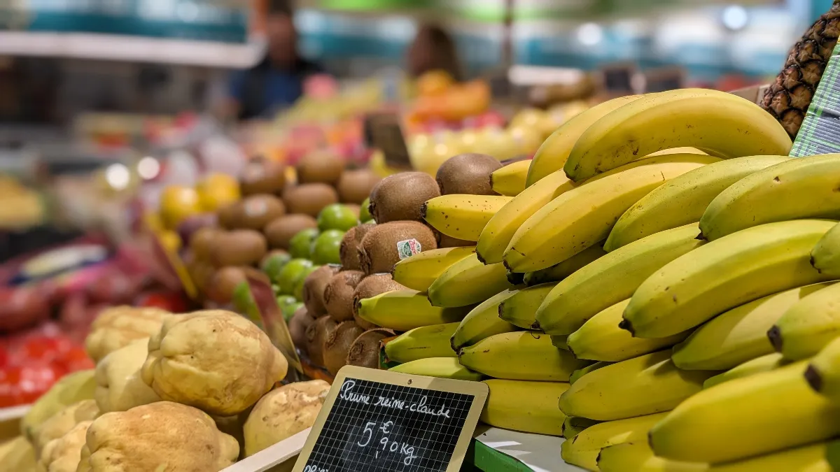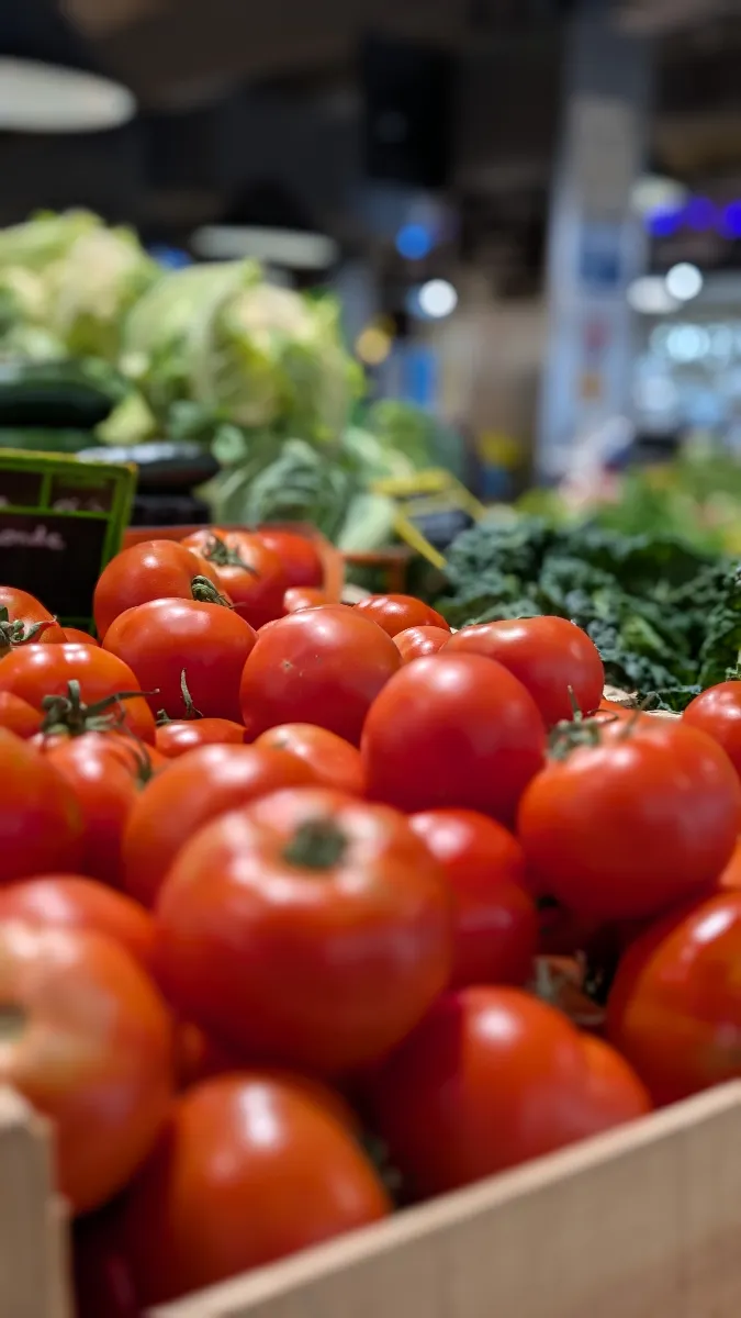 Du côté des fruits, l’offre est tout aussi impressionnante. Nous avons remarqué des bananes, des kiwis, des pommes, des oranges, des citrons, des melons, et une variété d’agrumes qui témoignent d’un approvisionnement diversifié. Les tomates grappe, bien rouges et charnues, attirent immédiatement le regard, tout comme les ananas exotiques qui apportent une touche de soleil à l’étal.