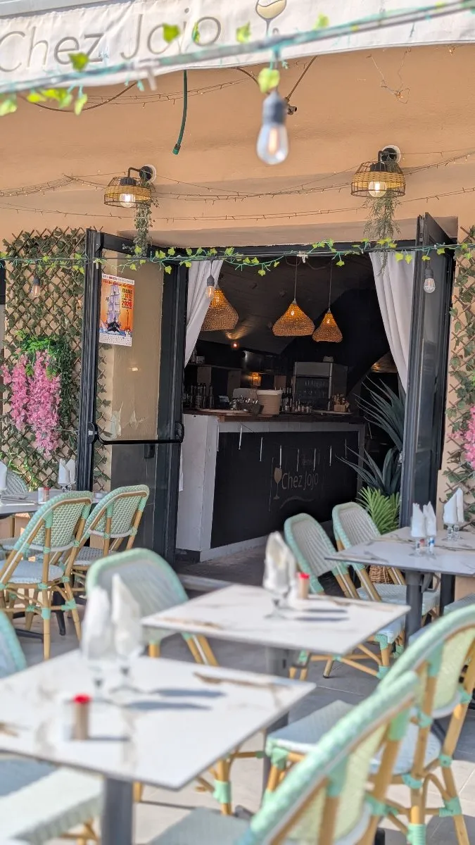 Depuis son ouverture début 2024, le Restaurant Chez Jojo a su s’imposer avec style sur le Quai Général Durand, face au canal principal de Sète. C’est l’une des nouvelles adresses que nous recommandons volontiers sur Ici7 : une table sincère, bien ancrée dans la cuisine méditerranéenne, avec une terrasse fleurie qui donne directement sur les bateaux du port. La déco soignée — chaises bistrot vert amande, treillages végétaux, guirlandes lumineuses et suspensions en rotin tressé — crée une atmosphère chaleureuse aussi bien en salle qu’en terrasse.