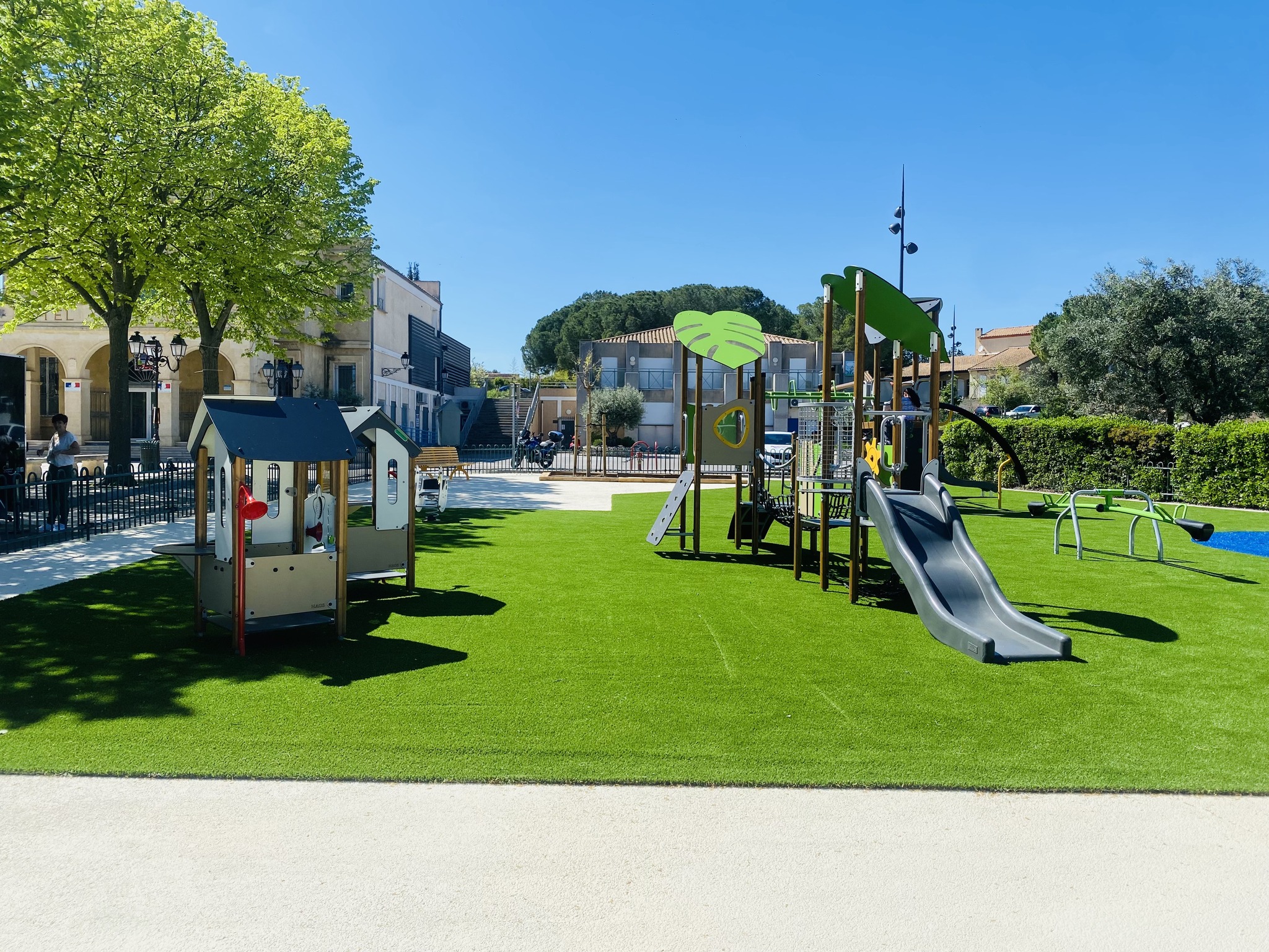 Ce qui frappe d’emblée en observant cette nouvelle aire de jeux, c’est la qualité et la diversité des équipements installés. Les structures colorées aux tonalités vertes et boisées s’intègrent harmonieusement dans le cadre verdoyant de la place centrale de Poussan. On y trouve des toboggans, des structures à grimper, des passerelles en filet, des maisonnettes interactives et bien d’autres jeux adaptés aux tout-petits comme aux enfants de l’école maternelle et élémentaire.